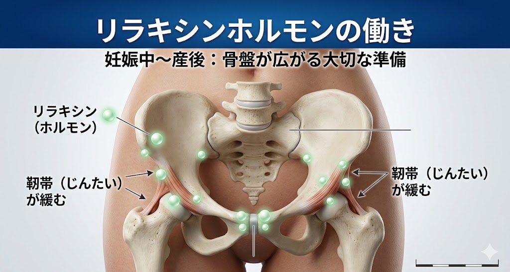 妊娠中に反り腰になり、靭帯が緩み、骨盤が不安定になる。